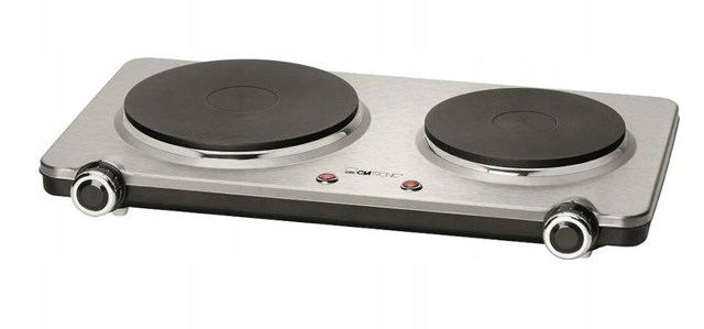 Комфортно готувати поза домом чи в незвичних умовах? Тепер це можливо завдяки електроплиті CLATRONIC з двома конфорками. Ідеально підійде для дачі, кемпінгу або маленької кухні. Нагрівальні плити: нагрівальна плита діаметром приблизно 185 мм, 1500 Вт, друга: нагрівальна плита діаметром приблизно 155 мм, 1000 Вт Перевагою духовки є легке очищення поверхні. Прилад виготовлений з високоякісної нержавіючої сталі.