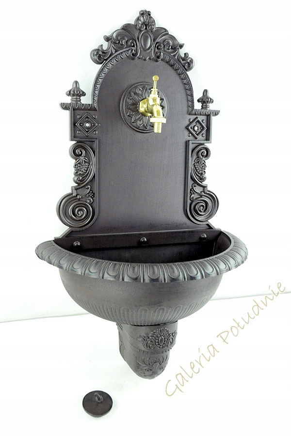 - Алюмінієва підвісна садова раковина зі змішувачем, прикрашена рослинним орнаментом.