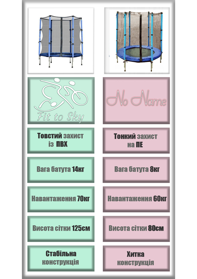 Ми б хотіли представити Вам батут для дому, саду марки FitToSky. Пропонований нами батут забезпечує веселі розваги як для дітей, так і для дорослих. Завдяки спеціально посиленій конструкції, зміцненим пружинам і сітці наш батут відрізняється великим запасом міцності в порівнянні з батутами конкурентів. Переваги даного батута в збільшеній товщині стінок трубок рами, а також поліпропіленового полотна для стрибків. Що дозволило збільшити максимально допустиме навантаження користувача. З'єднання сітки скріплене блискавкою, а також додатково карабіном. Батут відповідає європейським стандартам безпеки TUV і CE.